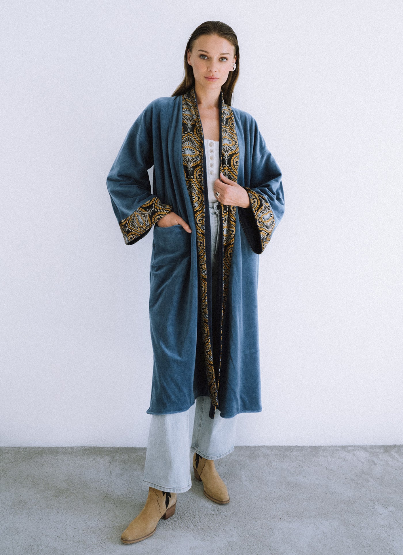 Elegancki płaszcz? Zawsze na czasie, ale czemu nie wybrać nieco „podkreconej” wersji? Velvet Kimono to ponadczasowy welur z charakterystycznym printem paisley nie pozwoli na nudę w codziennych stylizacjach, dodając im jednocześnie niewymuszonej elegancji. Klasyczny krój i cieplejszy, niezwykle miły w dotyku materiał świetnie sprawdzą się w niższych temperaturach.